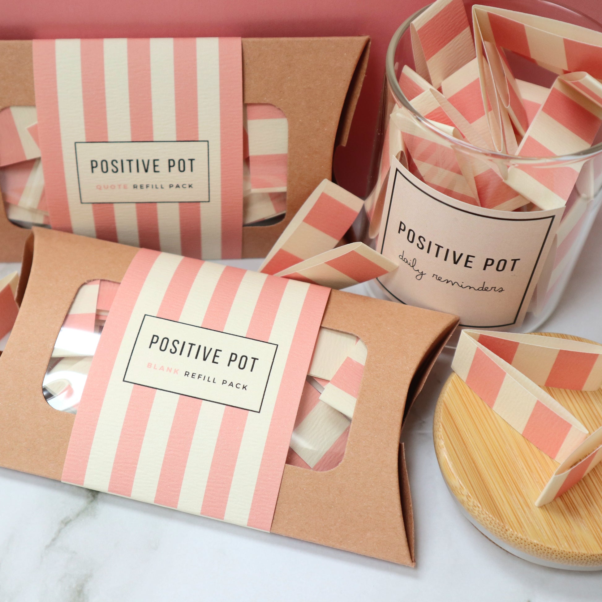 Our Pink Bundle pairs the Pink Positive Pot with two brand-new matching refill packs — one filled with 20 uplifting quotes, and one with 20 blank strips for your own words.