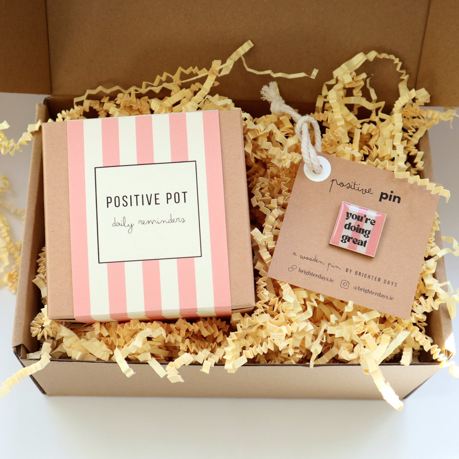 This bundle includes a Pink Positive Pot plus your choice of Pink Positive Pin. A pairing that’s soft, uplifting, and a little different.